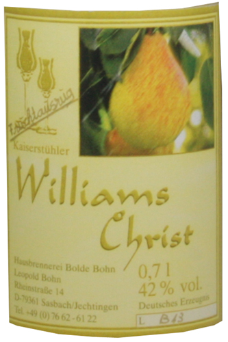 Die Birnen dieses Williams stammen aus der eigenen Kaiserstühler Obst-Plantage (Spalierbäume) von Bolde Bohn.
