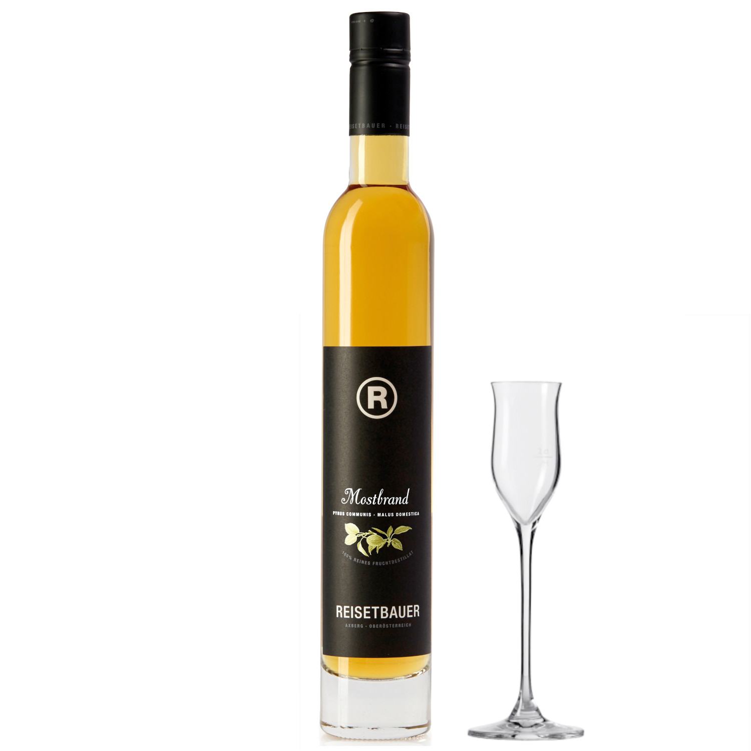 Der Mostbrand (Obstbrand) enthält Äpfel und Birnen aus eigenem Anbau der Brennerei Reisetbauer. Die Früchte werden nach der Ernte in einem kühlen Raum etwa zwei Tage eingelagert, damit sie dort die wichtige Nachreife erlangen können. Das hochwertige Apfel- und Birnenobst wird danach eingemaischt und bei 16 - 17° Celsius ungefähr ine Woche lang vergoren. Durch die anschließende, langsame und schonende Destillation erhalten wir den Mostbrand dieser außergewöhnlichen Güte. Dieser Brand wird anschließend für mindestens 3 Jahre im Eichenfass eingelagert. Für einen Liter dieses edlen Mostbrands werden ca. 12,2 kg frische Äpfel und Birnen verwendet.
