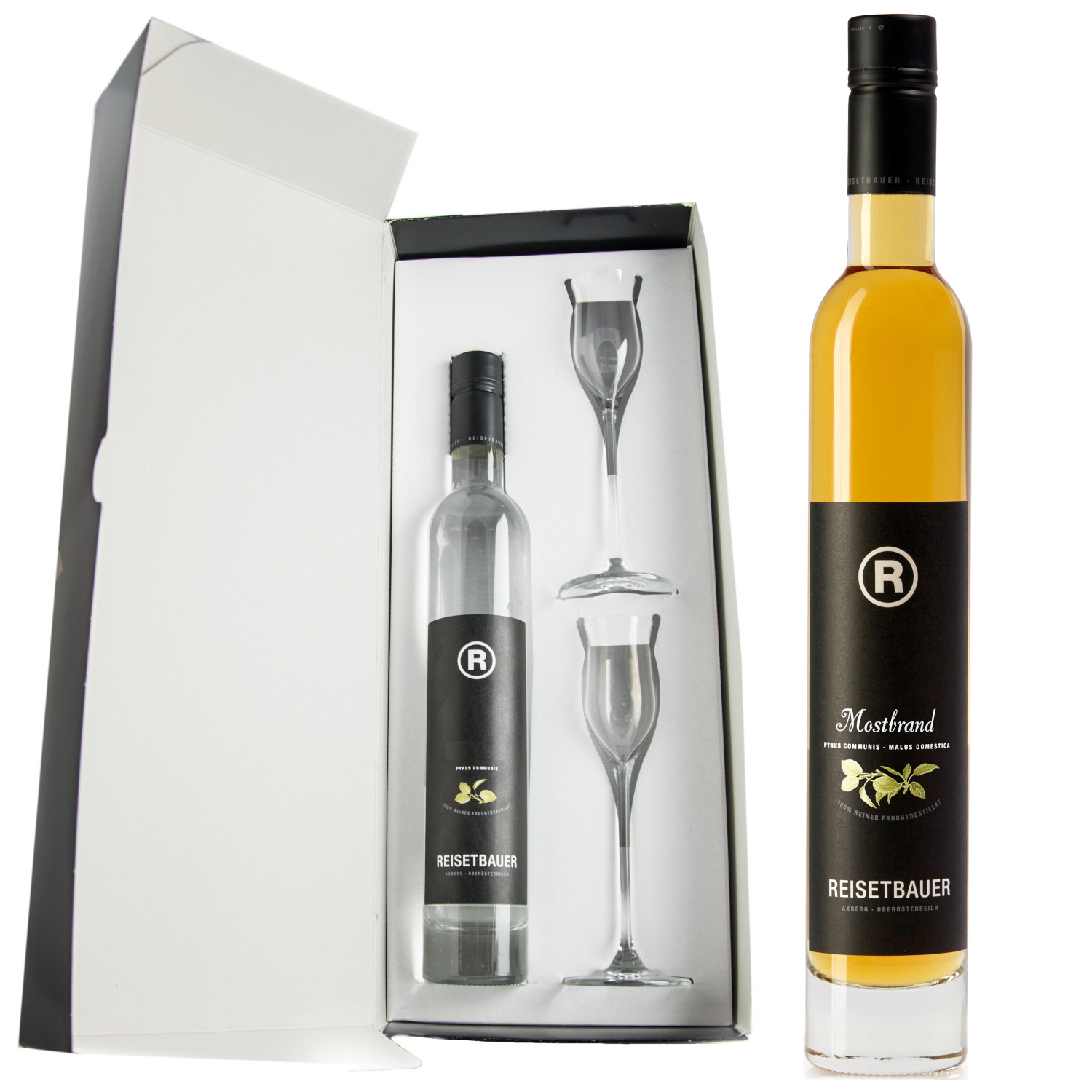 Der Mostbrand (Obstbrand) enthält Äpfel und Birnen aus eigenem Anbau der Brennerei Reisetbauer. Die Früchte werden nach der Ernte in einem kühlen Raum etwa zwei Tage eingelagert, damit sie dort die wichtige Nachreife erlangen können. Das hochwertige Apfel- und Birnenobst wird danach eingemaischt und bei 16 - 17° Celsius ungefähr ine Woche lang vergoren. Durch die anschließende, langsame und schonende Destillation erhalten wir den Mostbrand dieser außergewöhnlichen Güte. Dieser Brand wird anschließend für mindestens 3 Jahre im Eichenfass eingelagert. Für einen Liter dieses edlen Mostbrands werden ca. 12,2 kg frische Äpfel und Birnen verwendet.