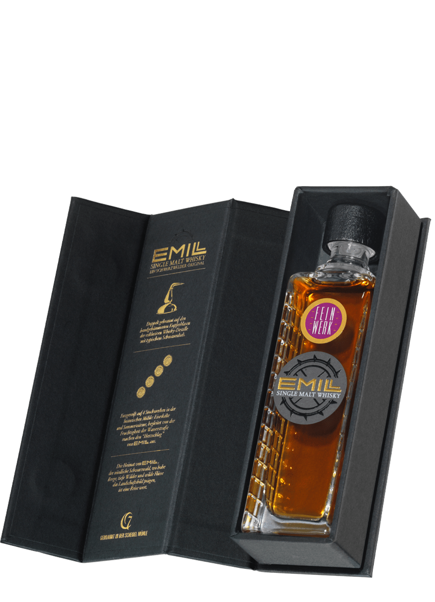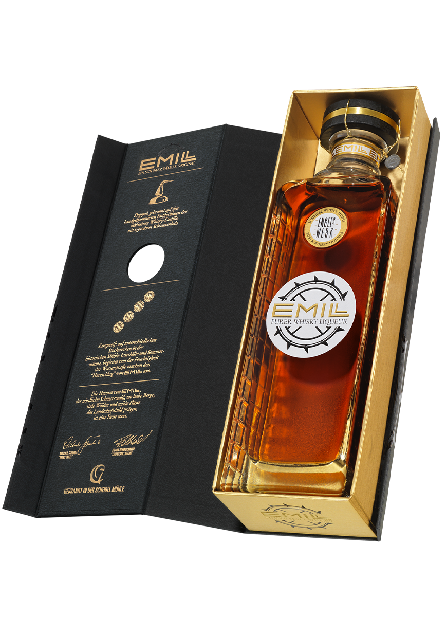 EMILL Engelswerk ist ein purer Whisky-Likör. Er ist ein echtes Schwarzwälder Original, gebrannt und gelagert in der historischen Scheibel Mühle in Kappelrodeck im Achertal. Ganz anders als bei Likören üblich, verzichten wir in der EMILL ENGELSWERK Rezeptur bewusst auf die Zugabe von weiteren Aromen oder Zutaten. ENGELSWERK ist eine Whisky-Cuvée, abgerundet zu einem puren Whisky-Likör.